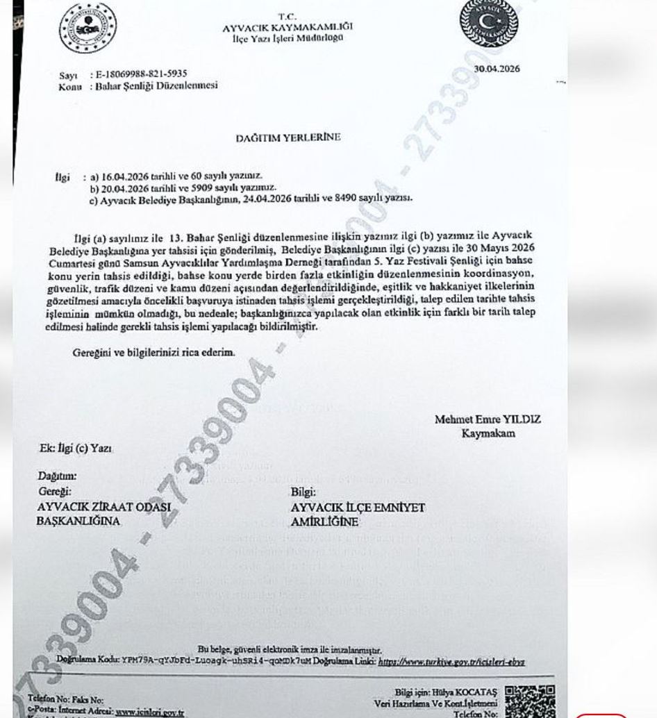 Kaymakamlık ayrıca Samsun Ayvacıklılar Derneği’nin Ayvacık Ziraat Odası’ndan önce başvuru yaptığını, 30 Mayıs tarihinin bu derneğe tahsisi edildiğini, eşitlik ve hakkaniyet ilkesi gereği Ayvacık Ziraat Odası’nın 30 Mayıs tarihi dışında bir tarihte şenlik için başvuru yapmasının değerlendiriliğini bildirdi.