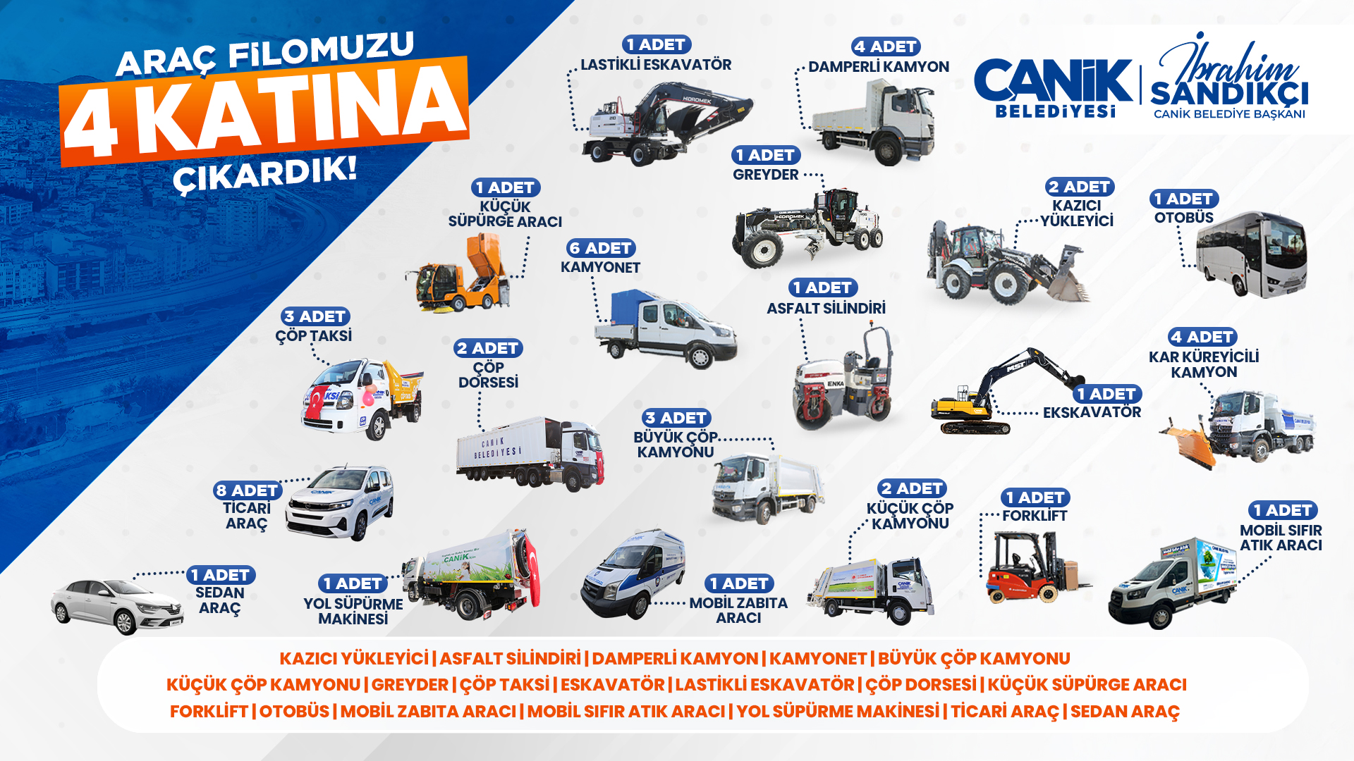 Güçlü araç filosuyla ilçedeki çalışmaları eş zamanlı olarak yürütürken, aynı zamanda çalışmaları kısa süre içerisinde tamamladıklarını ifade eden Başkan İbrahim Sandıkçı, "Yeni araçları belediyemize kazandırarak araç filomuzu güçlendirdik. Yeni araçlarımızla çalışmalarımızı hızlı ve etkin bir şekilde sürdürürken, belediyemiz araç filosuna yeni araçları dâhil etmeye devam ediyoruz. Yeni iş makinaları ve temizlik araçlarının ardından yeni hizmet araçlarını belediyemiz araç filosuna dâhil ettik. Canik'imizde sürdürdüğümüz yatırım, etkin ve hızlı hizmet seferberliğiyle araç filomuzu 4 katına çıkardık. Yeni araçları belediyemize kazandırmaya, hizmet kapasitemizi her daim yukarıya taşımaya devam edeceğiz" şeklinde konuştu.