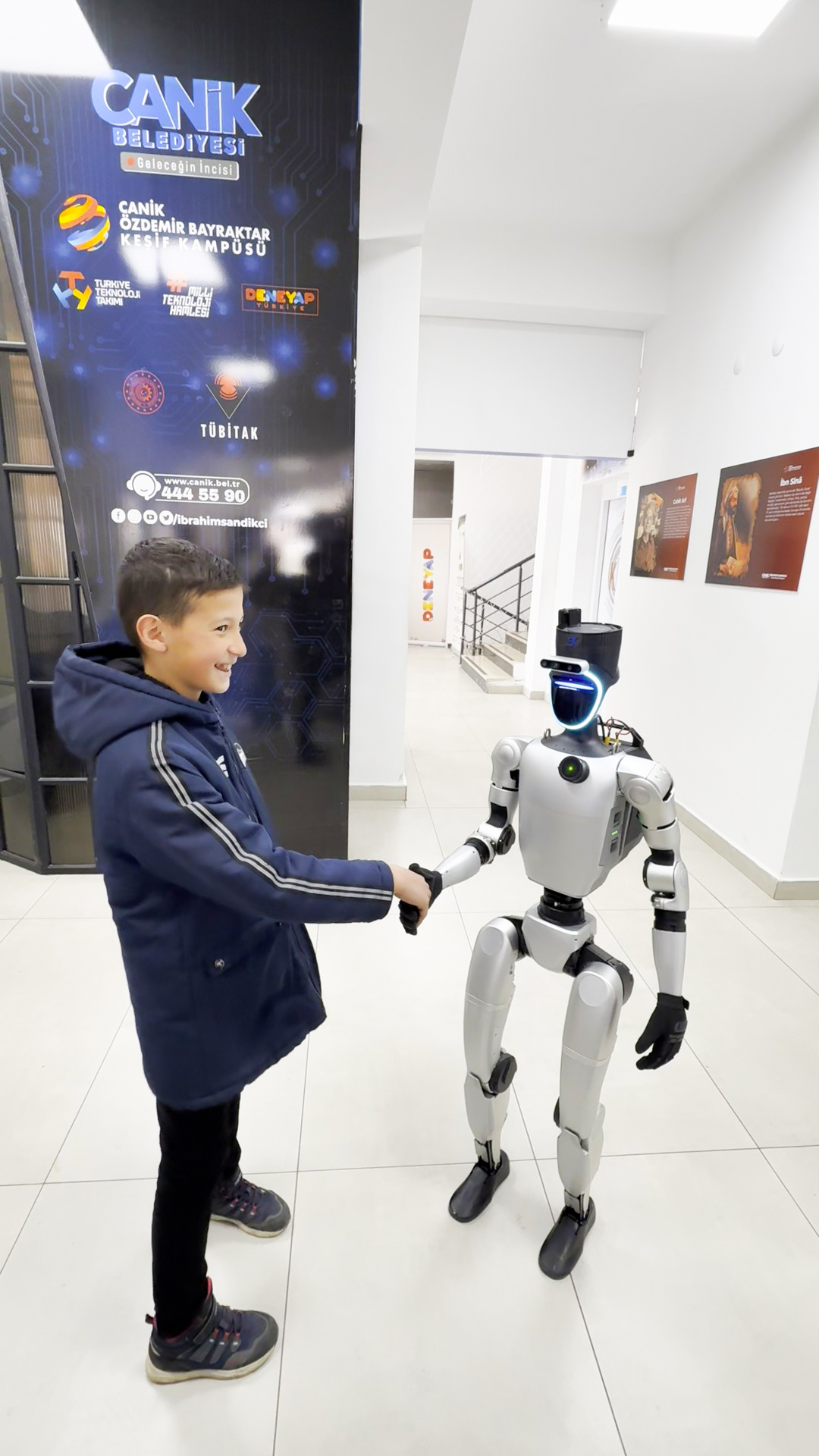Canik Özdemir Bayraktar Keşif Kampüsü Deneyap Teknoloji Atölyesi Öğrenci Seçme Sınavı'na katılan öğrencileri ve aileleri insansı robot CANİKMAN karşılıyor.