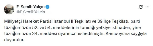 Partinin Genel Başkan Yardımcısı Semih Yalçın, İstanbul teşkilatının tamamının feshedildiğini şu sözler ile duyurdu: "Milliyetçi Hareket Partisi İstanbul İl Teşkilatı ve 39 İlçe Teşkilatı, parti tüzüğümüzün 52. ve 54. maddelerinin tanıdığı yetkiye istinaden, yine tüzüğümüzün 34. maddesi uyarınca feshedilmiştir. Kamuoyuna saygıyla duyurulur."