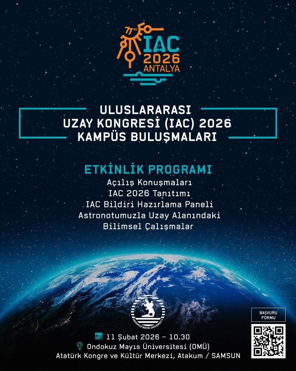 Türkiye’nin uzay vizyonunu akademik dünyaya taşımayı hedefleyen “77. Uluslararası Uzay Kongresi (IAC) 2026 Kampüs Buluşmaları”nın sekizinci durağı Ondokuz Mayıs Üniversitesi oluyor. OMÜ Atatürk Kongre ve Kültür Merkezinde 11 Şubat Çarşamba günü saat 10.00’da başlayacak etkinlikte, Türkiye’nin astronotu Tuva Cihangir Atasever, Samsunda gençlerle ve akademisyenlerle bir araya gelerek uzay deneyimlerini ve gerçekleştirilen bilimsel deneyleri paylaşacak.
