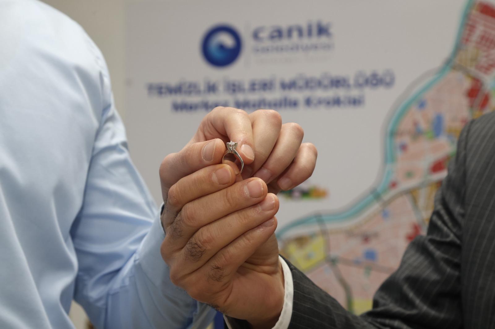 Canik Belediyesi Temizlik İşleri Müdürlüğü ekipleri, ilçede gerçekleştirdiği temizlik çalışmaları esnasında bulduğu kayıp ziynet eşyasını sahibine ulaştırdı. Canik Belediyesi Katı Atık Aktarma İstasyonu'nda çöp kamyonu boşaltım işlemi gerçekleştiren ekipler, işlemler sırasında beyaz bir çanta içerisinde pırlanta yüzük olduğunu fark etti.